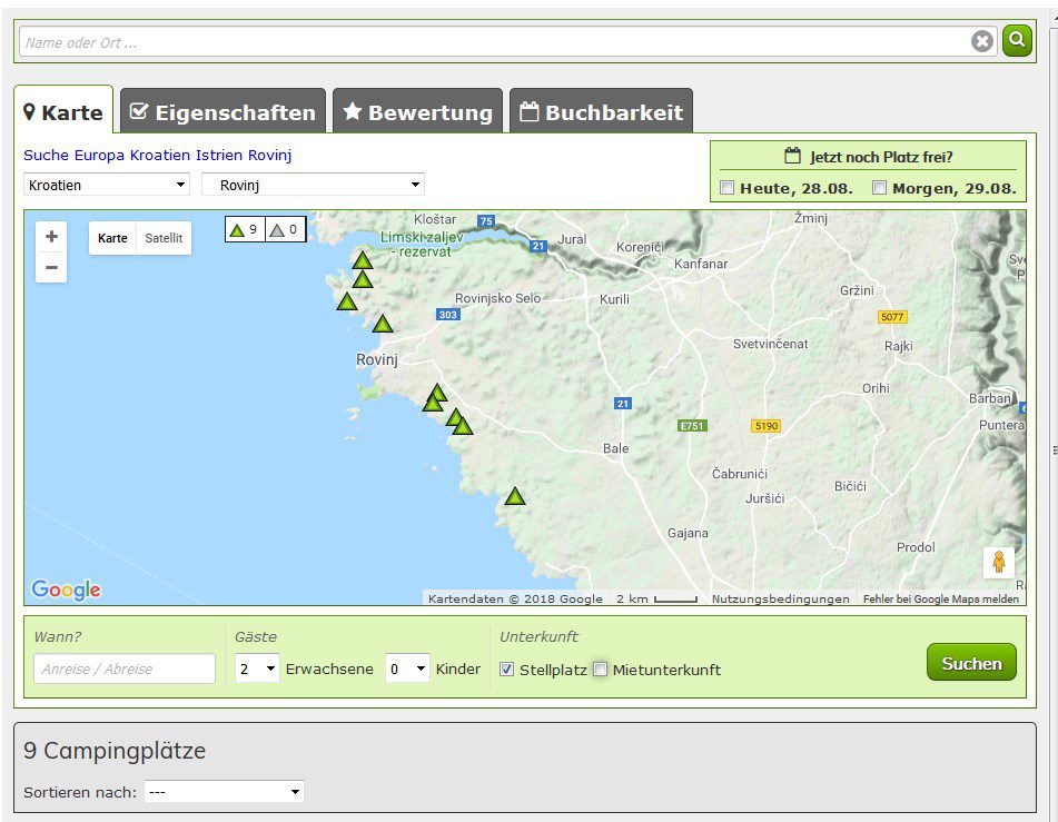 Empfehlen möchten wir Ihnen hier die Seite https://camping-experten.de/campingfuehrer/ mit der integrierten Suche von www.camping.info. Hier sind momentan ca. 23.000 Campingplätze aufgeführt. Zu jedem Campingplatz gibt es Bewertungen anderer Camper, ausführliche Informationen, Fotos von Urlaubern und dem Betreiber, Preise und Kontaktdaten. Die Seite verfügt über eine umfangreiche Suchfunktion, bei der man seine Vorlieben vorher per Kreuzchen bestimmen kann. Die Suche wird dann nach diesen Vorlieben eingeschränkt.
